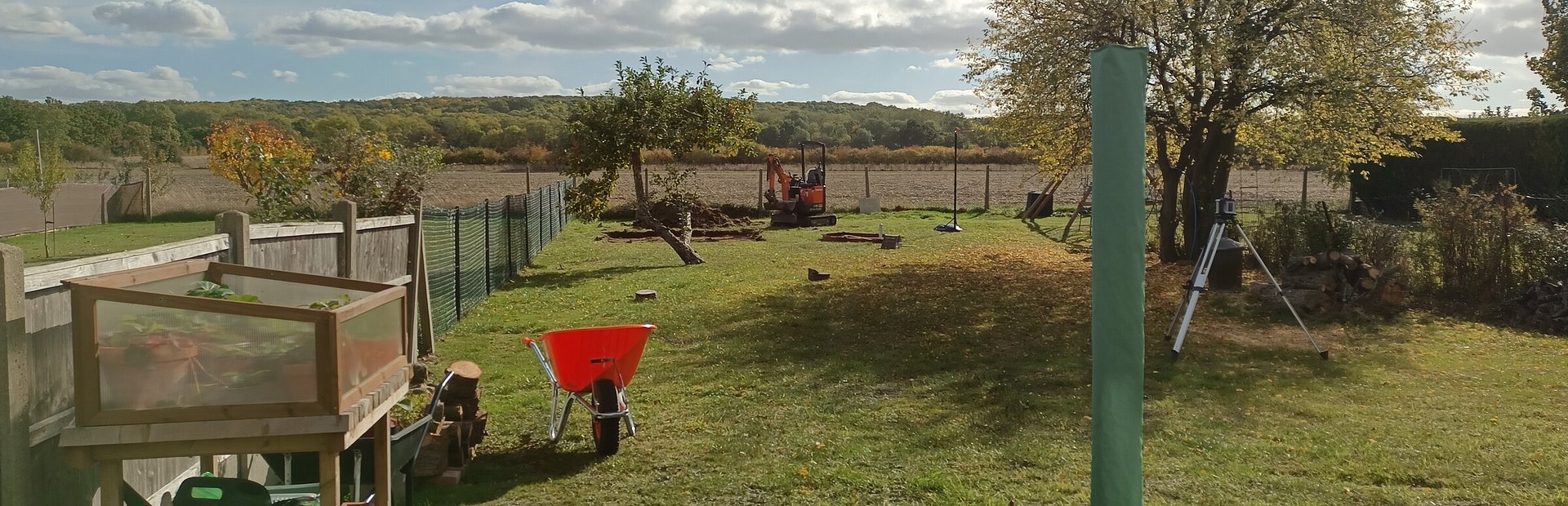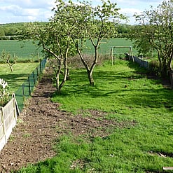 The above view shows my own garden from the back of the house with a great view across the fields in a southerly direction. The garden was relatively tidy when we started albeit neglected beyond basic grass cutting. There were some very established shrubs and a number of old fruit trees well beyond their best. The shrubs were removed early on to allow the building works to proceed. The ultimate plan is decking and paving to the rear of the house a pathway up the garden and an outdoor covered cooking space with some adjacent seating.