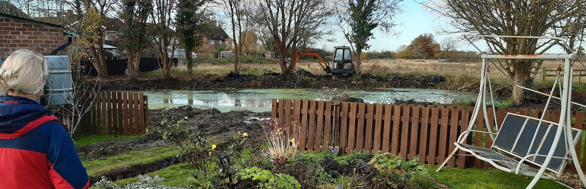 This job was to transform an area of land that the client had recently purchased. It had a well established pond fed by an underground spring and was never dry. The project started in the winter months with the clearance of lots of floating pond weed. Lots of care was taken not to disturb the banks or alter the shape of the pond. There was just enough access all the way round by arrangement with the neighbours.